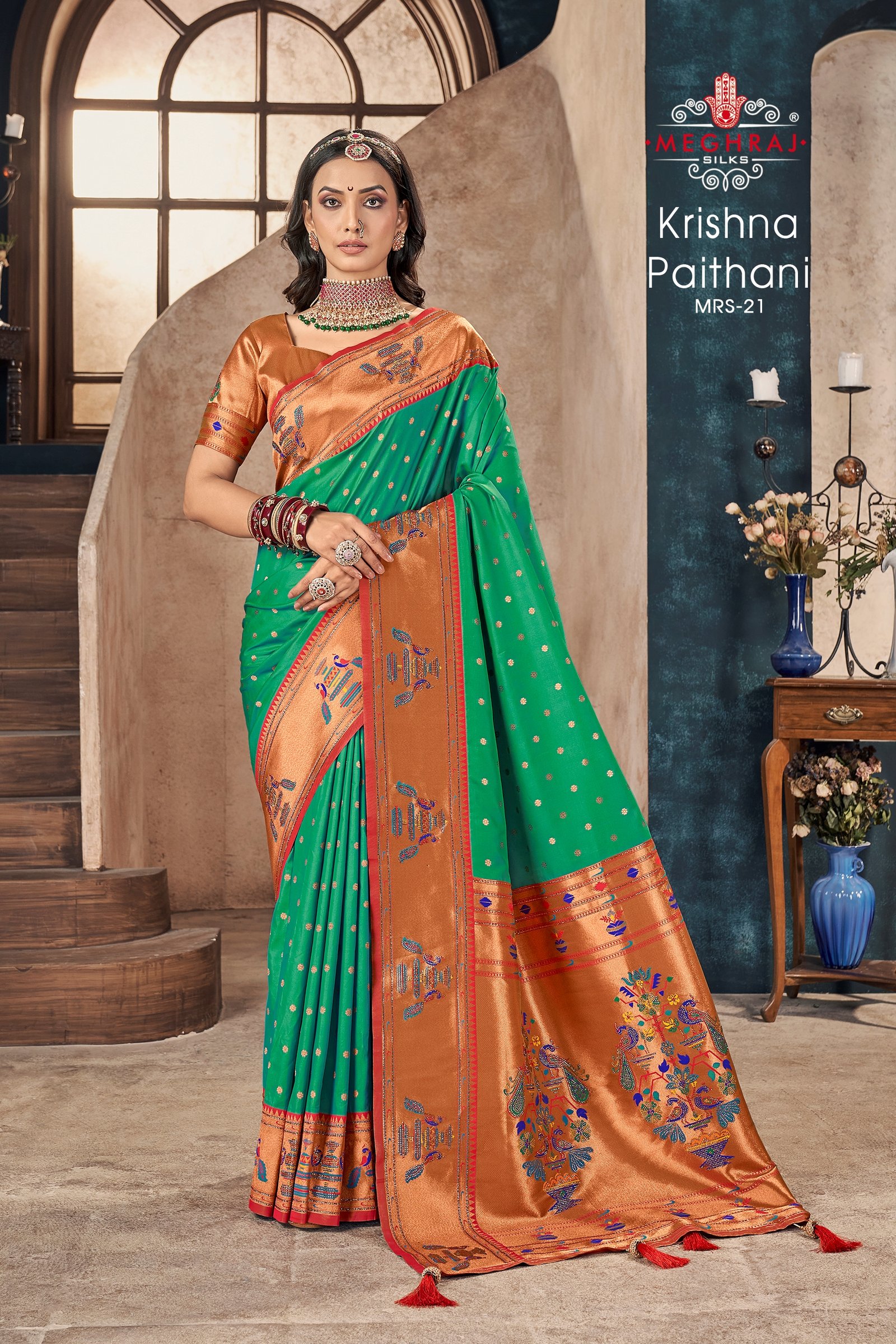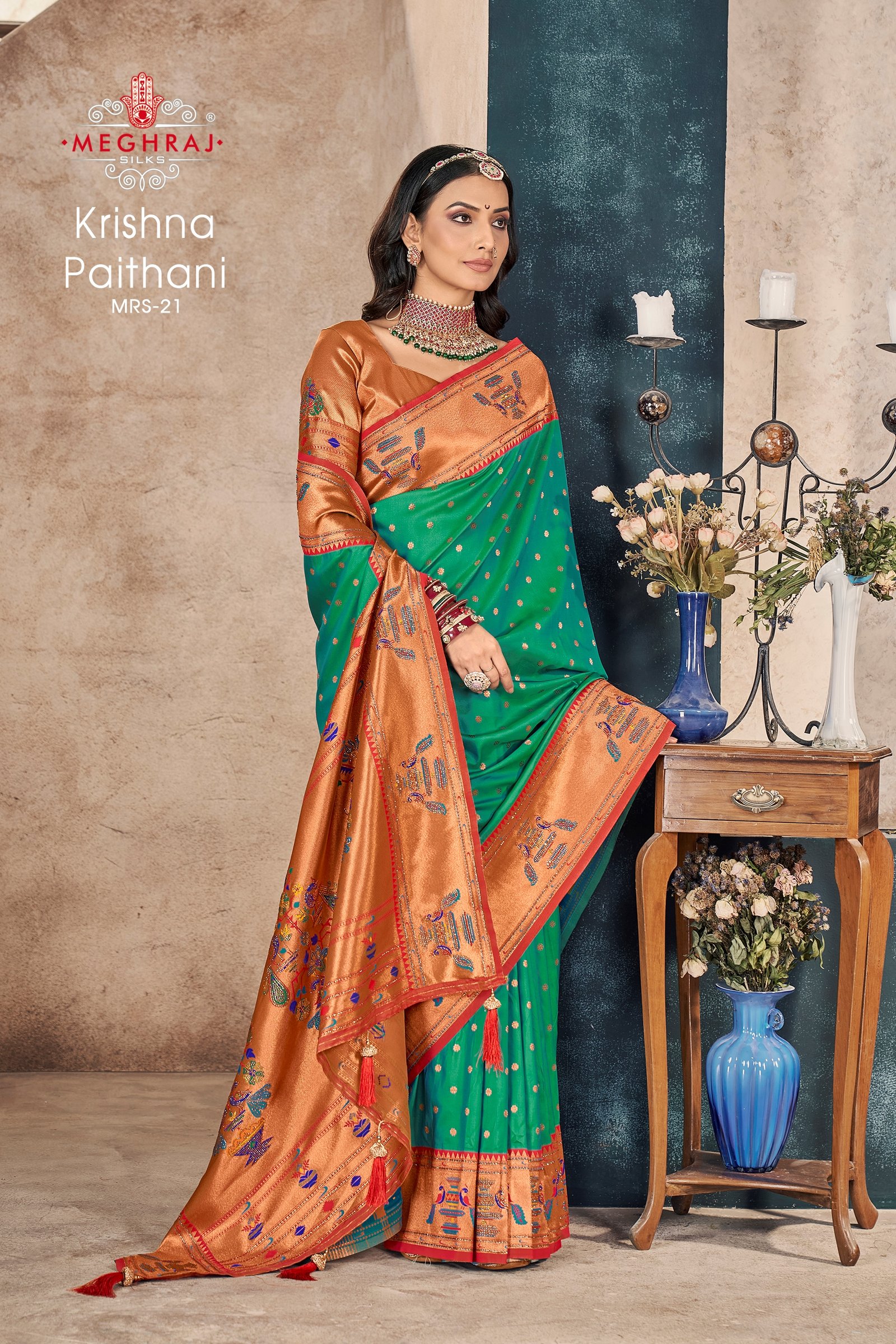 The Krishna Paithani MRS 21 Saree is a symbol of elegance and tradition, featuring handwoven silk and unique Paithani designs that reflect cultural artistry. Its vivid hues and intricate pallu work create a regal look for any festive occasion.