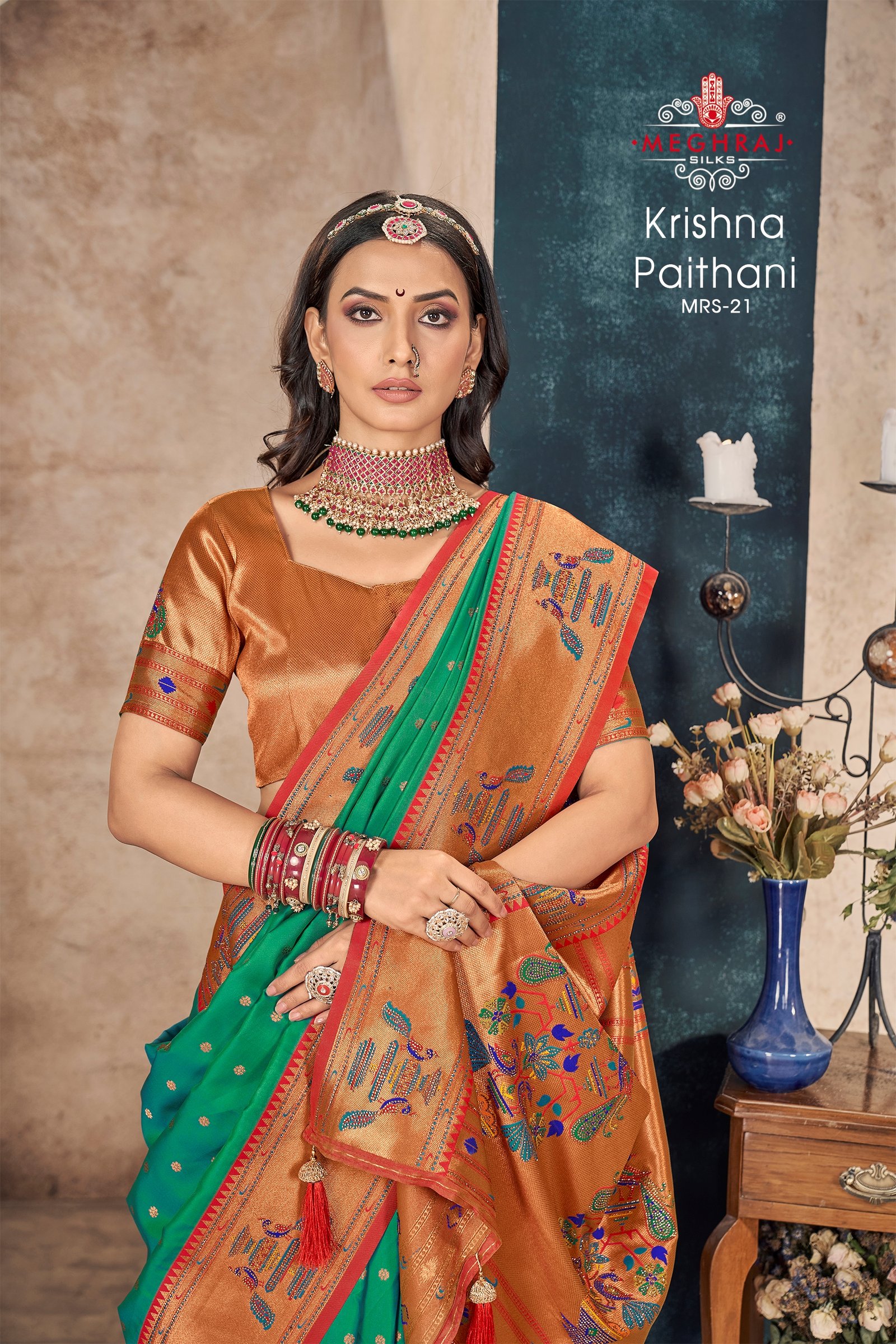 Crafted with care and precision, the Krishna Paithani MRS 21 Saree blends vibrant colors with exquisite zari work, making it a perfect choice for weddings, festivals, and special occasions. Its luxurious silk fabric offers both comfort and style.